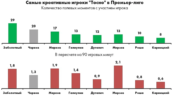 Из игроков средней линии выделяются тяготеющие к флангам Вагиз Галиулин (лидер команды по числу ключевых передач – 2,5 в среднем за 90 минут) и Резиуан Мирзов (лучший по успешным обводкам – 1,3), который все чаще стал появляться в «старте» (во многом именно с этим связан всплеск созидательной активности «Тосно» в последних матчах).