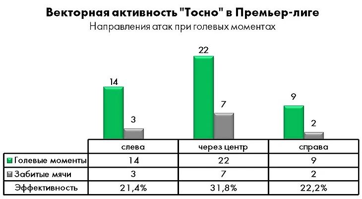 Стоит отметить и динамичное приращение базовых атакующих показателей команды по ходу чемпионата: если в 8 стартовых турах созидательная активность «Тосно» находилась на уровне 2,6 голевых момента в среднем за матч, то в 8 последующих выросла в полтора раза – 4,1.