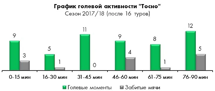 Пологий график созидательной активности без явных экстремумов косвенно намекает на то, что команда Парфенова неплохо готова физически. Стоит обратить внимание на высокую дебютную активность «Тосно» (7 из 14 забитых мячей приходятся на стартовые отрезки таймов) и способность добавить в концовке.
