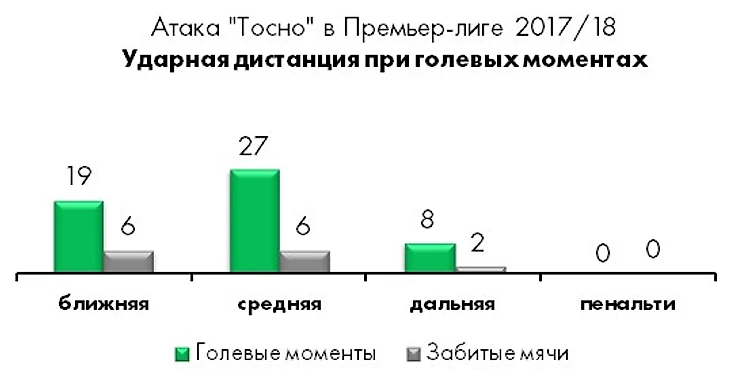 Достаточно спокойно переварив неудачи на старте, команда Дмитрия Парфенова стала все чаще не только «показывать зубы», но и покусывать соперников при каждом удобном случае. Созидательная активность «Тосно» вполне сопоставима, например, с аналогичным прошлогодним показателем «Ростова» (3,3 против 3,4 голевых моментов в среднем за матч) и, если бы не проблемы с реализацией (26,9% - почти на 10% ниже, чем у дончан в сезоне 2016/17), тосненцы вполне могли бы побороться за место в топ-8 по итогам первого круга.
