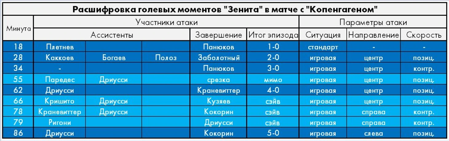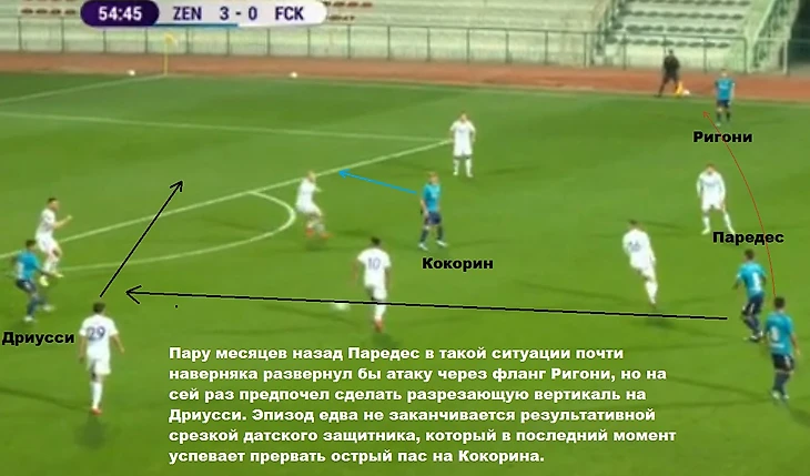 Отдельными отрезками и «Копенгаген» включал интенсивный высокий прессинг, выбираться из-под которого зенитовцы старались через короткие передачи (по всей видимости, следуя указаниям тренера). Получалось это далеко не всегда, и несколько потерь на своей половине привели к пожароопасным ситуациям, тушить которые удавалось только в последний момент. Очевидно, что повышение устойчивости к прессингу – одна из ключевых задач, которую команда будет решать в ближайшее время.