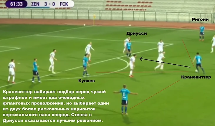 Помимо диспетчерских функций, Дриусси привычно активничал в прессинге, да и вообще в этом компоненте команда Манчини на протяжении всего матча смотрелась прилично (4 отбора/перехвата в атакующей трети, которые переросли в голевые ситуации). Не факт, что настолько агрессивно душить соперника получилось бы, играй «Зенит» одним составом не 45 минут, а все 90, но именно в плане синхронности действий команда порадовала.