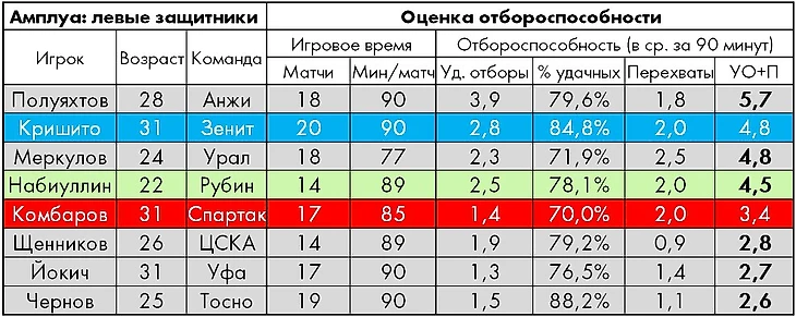 Набиуллин в рамках своего амплуа имеет неплохую оборонительную статистику. Он в пятерке лучших в лиге по отборам, перехватам и заблокированным передачам. При этом нельзя сказать, что его цифры космические. Ниже в таблицах представлены показатели левых защитников, отыгравших в своих клубах не менее 14 матчей преимущественно на этой позиции.