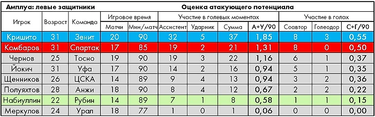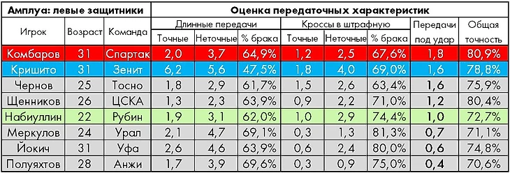 Набиуллин держится в топ-5 только за счет навесных стандартов – их он действительно выполняет неплохо (хотя в «Спартаке» и «Зените» есть исполнители как минимум не хуже). Но в целом его передачи не впечатляют, и нет явных предпосылок к тому, что с попаданием в более конкурентную среду он резко прибавит.