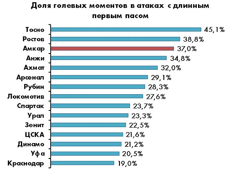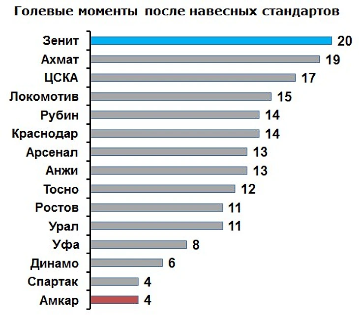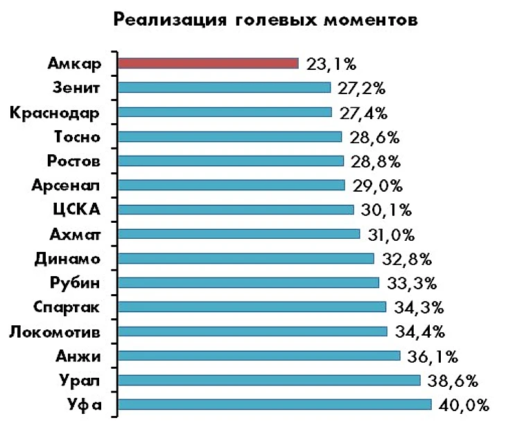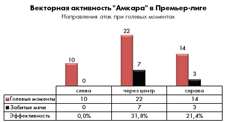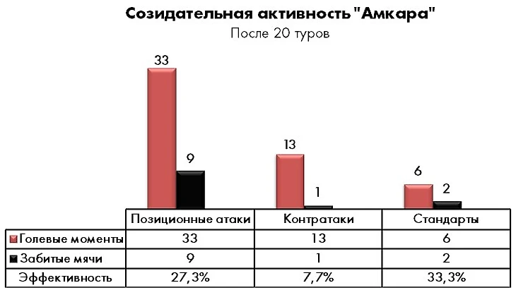 Оценка структуры голевого созидания позволяет с точностью определить две хронические болезни «Амкара», которые нуждаются в срочном лечении – почти нулевая контратакующая эффективность и откровенно слабое исполнение стандартов (а ведь для хрестоматийного андердога по умолчанию имеют огромную важность оба).
