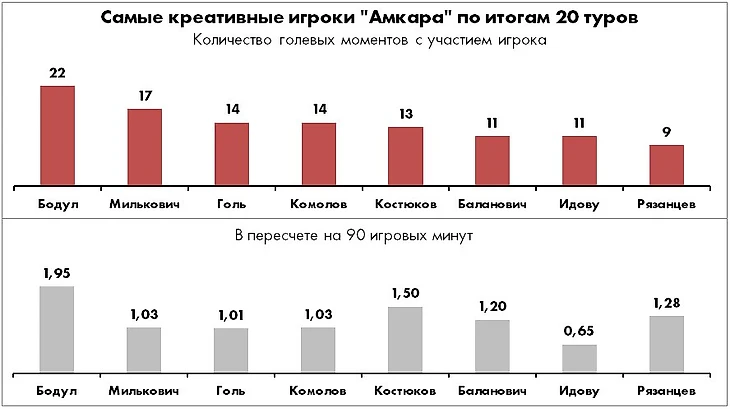 Вполне вероятно, что курс на вертикализацию атак будет продолжен, потому как в паре с Оланаре можно использовать не забивного, но при этом крайне полезного в подыгрыше Дарко Бодула (к слову, лидера «Амкара» по ключевым и голевым передачам).