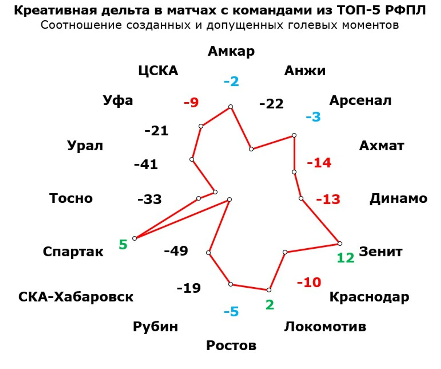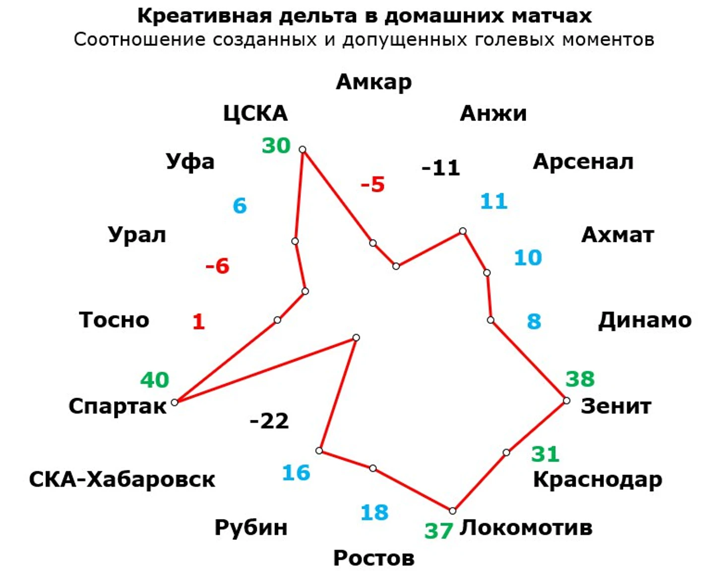 Интересно, что пермяки и здесь «отличились» в том смысле, что их креативный баланс в матчах с топами (-2) заметно лучше, чем против соперников в своей «весовой категории» (-13). Оно и понятно – тактика пресловутого автобуса там уже не работает, а других ресурсов попросту нет.