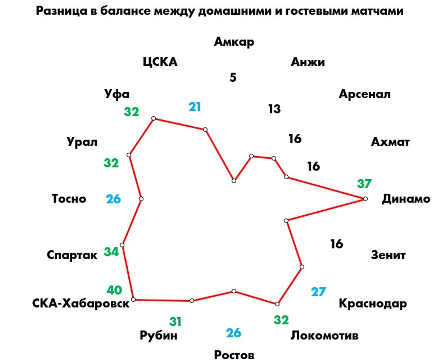 4. Помимо «Амкара», относительно стабильным балансом могут похвастаться «Анжи», «Арсенал, «Ахмат» и «Зенит», а наиболее зависимы от фактора поля хабаровчане (+40 – ну кто бы сомневался), а также столичные «Динамо» (+37) и «Спартак» (+34).
