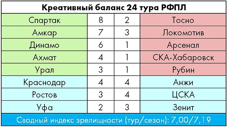 24 тур прошел без элитных междусобойчиков, но все записные фавориты, кроме разве что «Спартака», серьезно помучились. Зрелищность тура – чуть ниже среднего (56 моментов в 8 играх), но это объяснимо – в Уфе и Ростове были сложные полевые условия, а «Рубин» на выезде мастерски не давал играть «Уралу» (сам, понятно, не играл тоже).