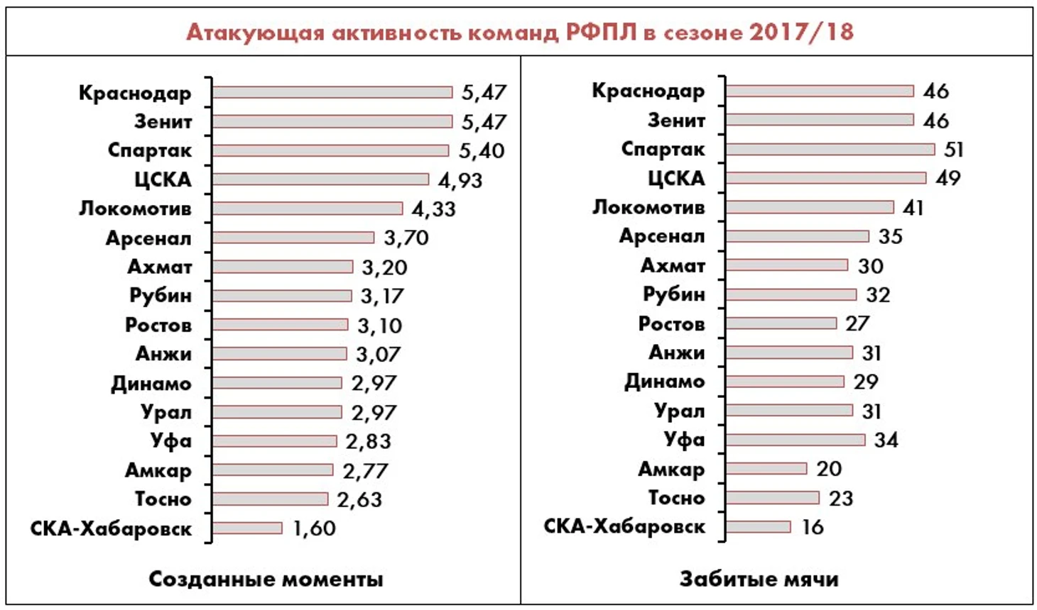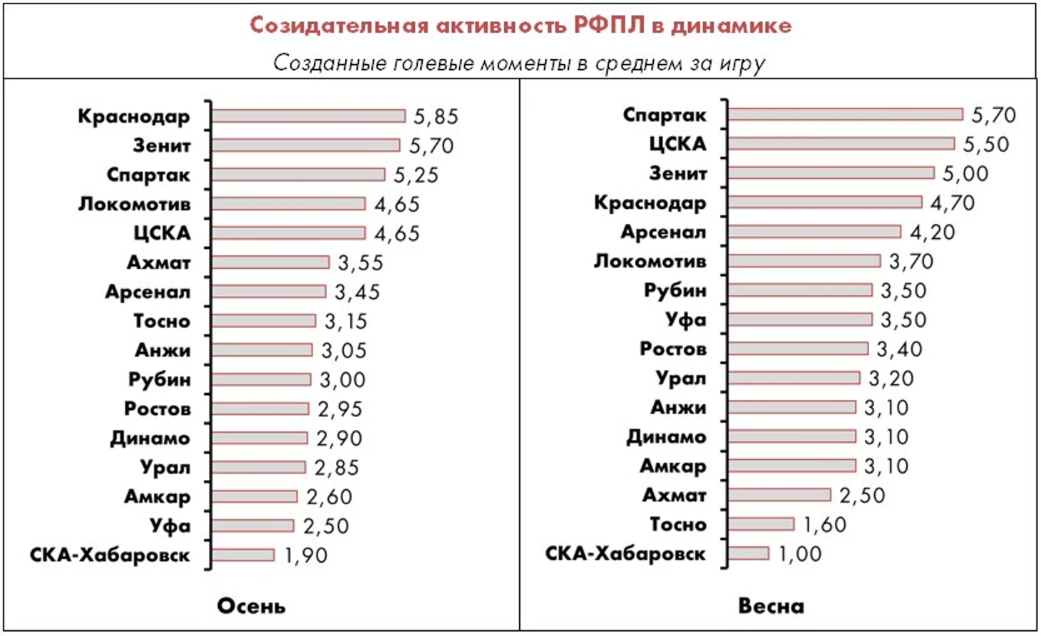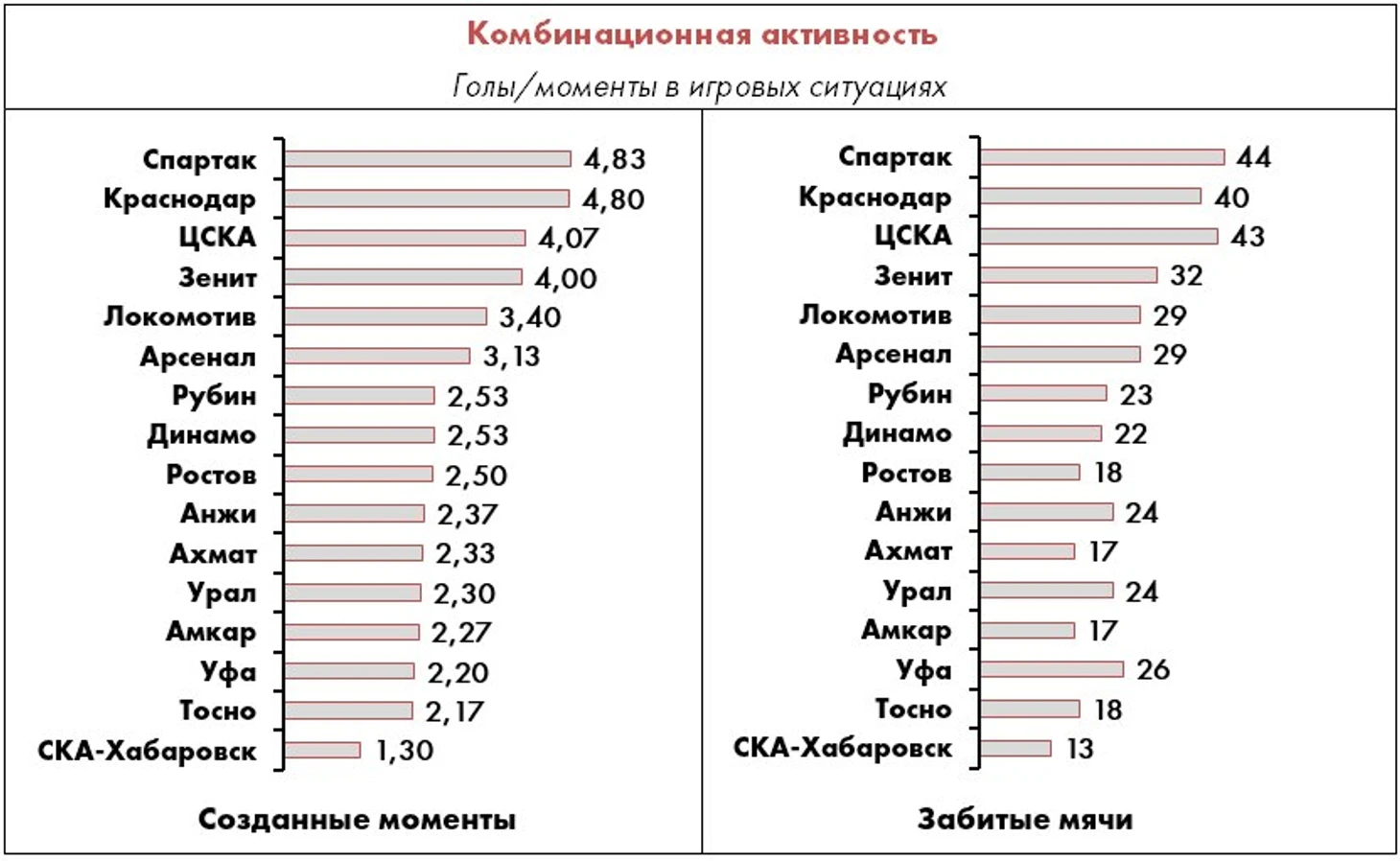 Если вынести стандарты за скобки и рассматривать только креатив в игровых ситуациях, с приличным отрывом от остальных к финишу чемпионата подошли «Спартак» и «Краснодар», из команд «второго эшелона» явно выделялся «Арсенал» (отрыв от «Рубина» больше, чем отставание от «Локомотива»), а ЦСКА и «Уфа» отличались бережным отношением к созданному.