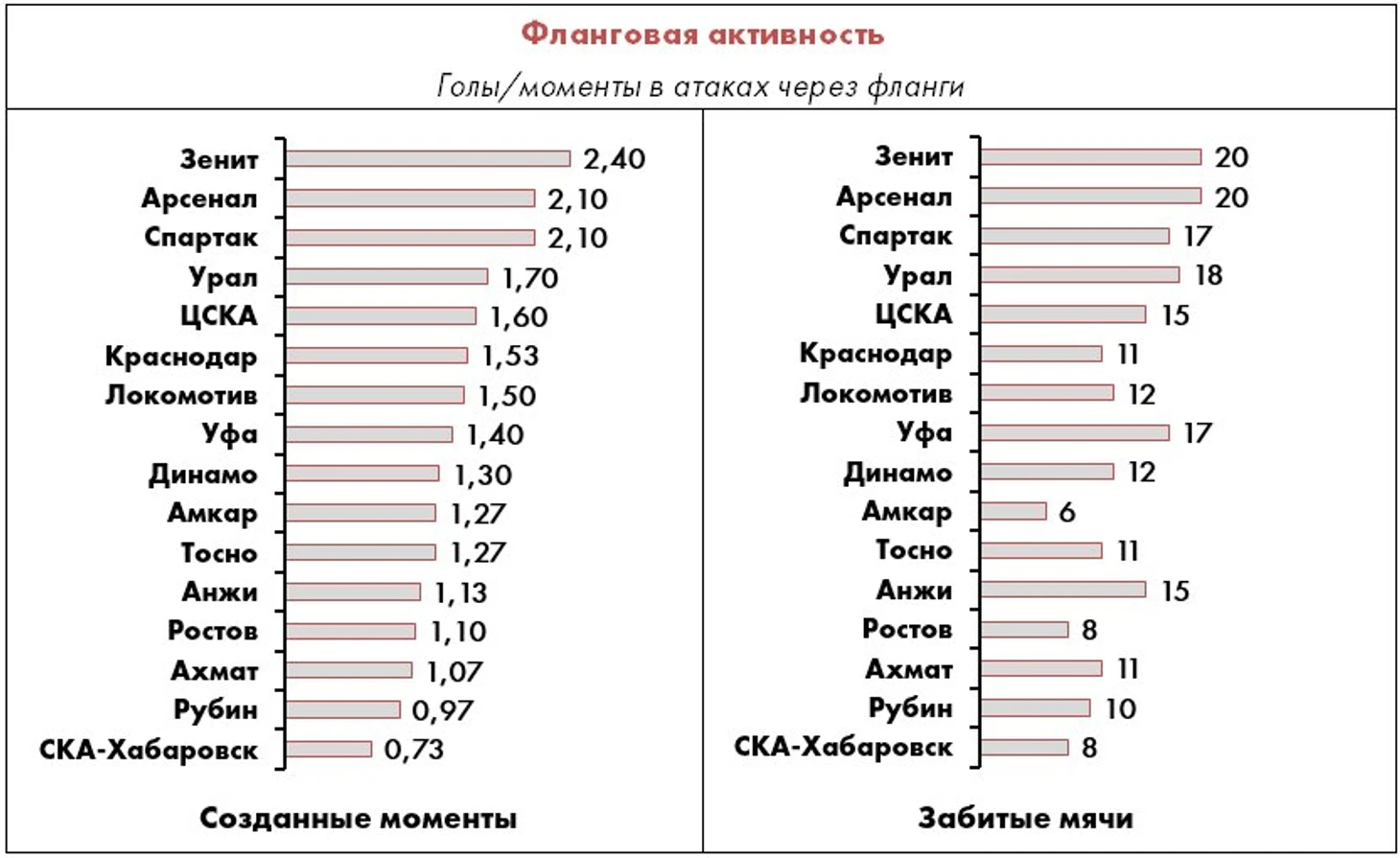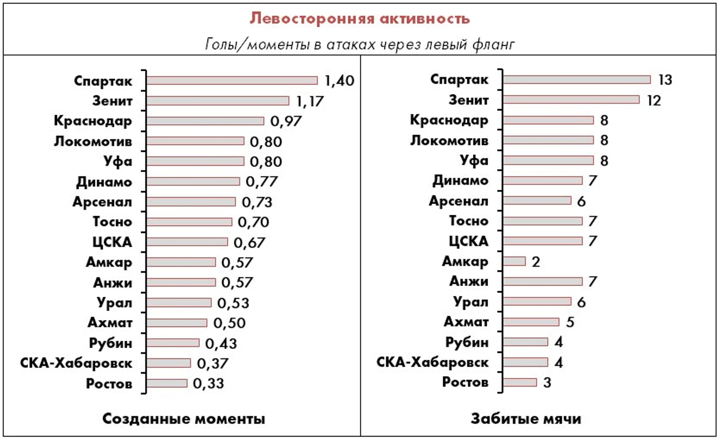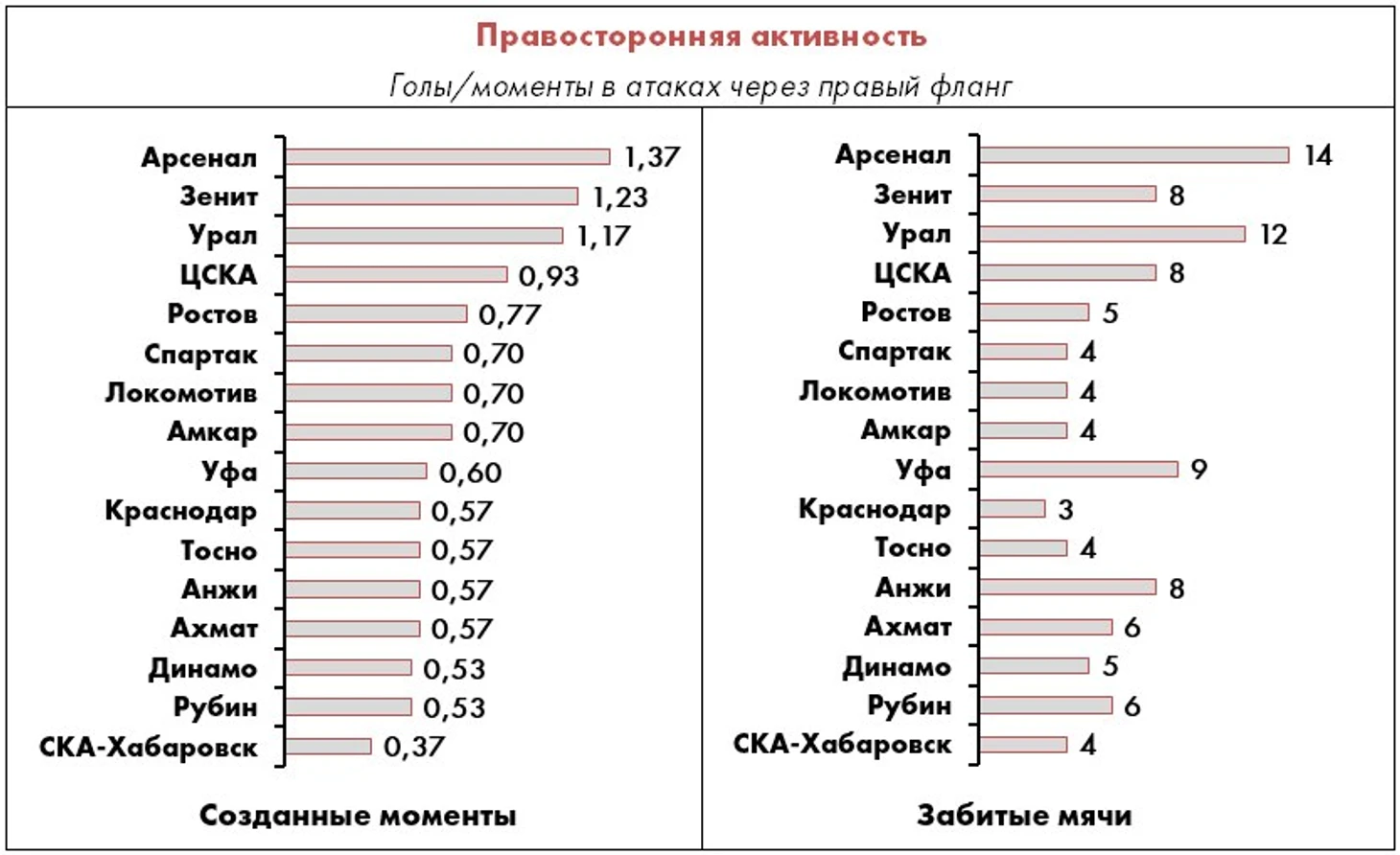 Правый фланг у среднестатистического представителя лиги функционирует чуточку лучше левого, но распределение голов почти равномерное (107 против 104). При этом «второй эшелон» намного опаснее атаковал именно справа: «Арсенал», «Уфа» и «Урал» в сумме забили больше, чем пять представителей элиты – 35 мячей против 27.