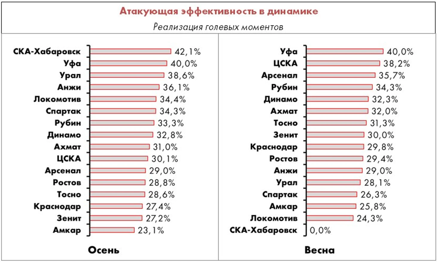 Самого мощного прироста в позиционном креативе весной добился «Рубин» (с 1,4 до 2,7 голевых моментов за игру – плюс 92%), где Нобоа под чётким руководством Бердыева снова обрел гармонию и выдал целую серию просто изумительных дирижерских перфомансов. Что касается результативности, ощутимо прибавить на финише, помимо казанцев, удалось только «Уфе», ЦСКА и «Арсеналу» (+20% и более), тогда как сразу 7 команд лиги, включая «Зенит» и «Локомотив», ушли в серьезный минус (-20% и более).
