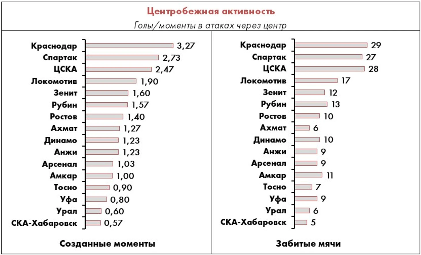 Самый активный центральный вектор традиционно у «Краснодара», но «быкам» зачастую мешала их прямолинейность и предсказуемость (против топ-соперников – в первую очередь). Та же проблема, но под другим углом и у «Зенита» - чудовищный перекос на фланги при отсутствии достаточного количества исполнителей, подходящих под такую модель по игровым характеристикам.