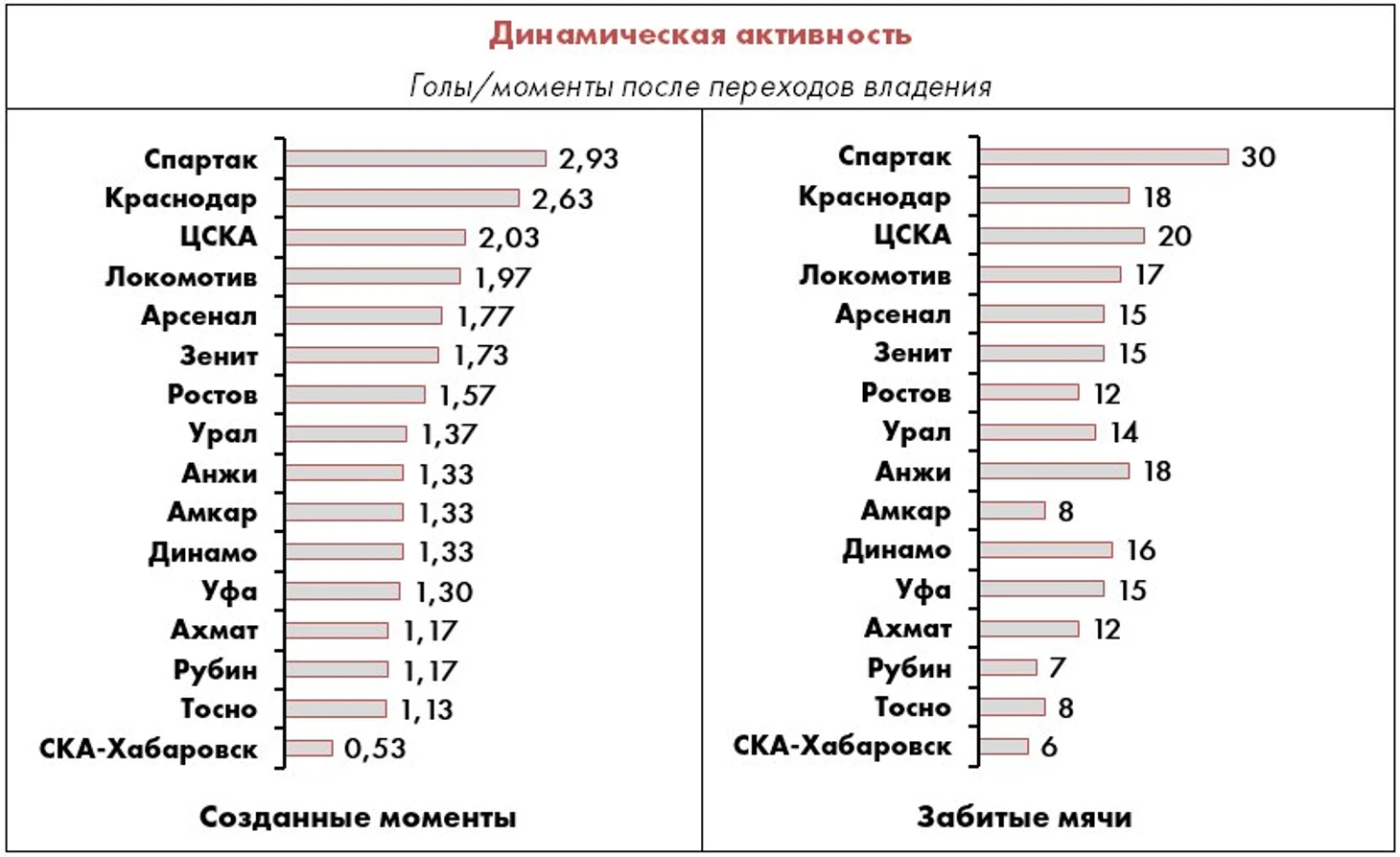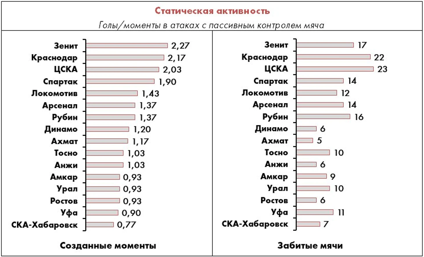 Обострять из фазы пассивного контроля у команд РФПЛ в целом получалось несколько хуже (доля таких моментов в общей массе составила 46% против 54% в «переходных» атаках), хотя ЦСКА и отчасти «Краснодар» успешно справлялись с обеими задачами.