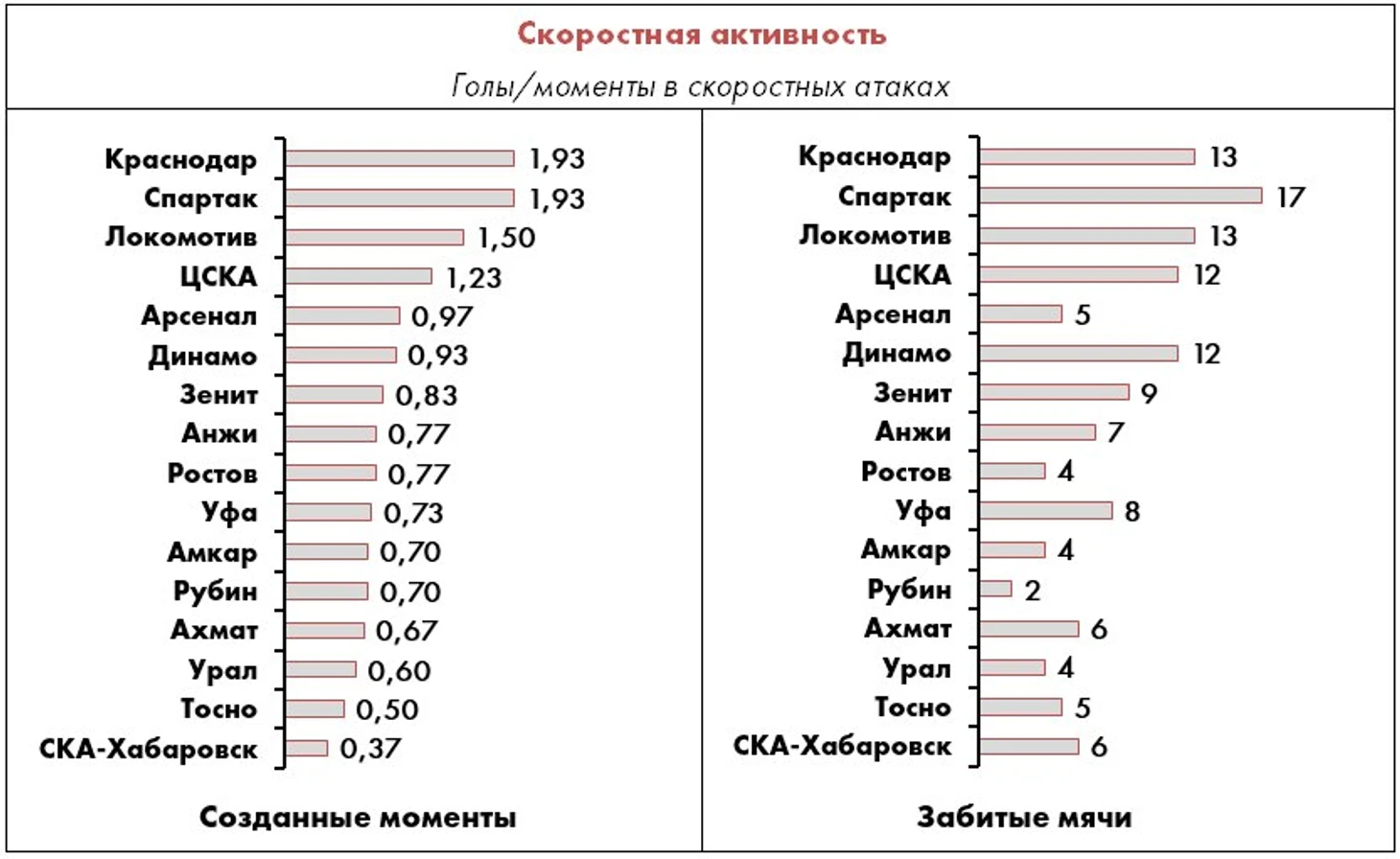 В быстром нападении лучше всех проявил себя «Спартак», но успехи красно-белых фактически ограничились осенним отрезком (14 голов из 17 – в первых 20 турах). Аналогичная ситуация у «Локомотива» (только 2 гола в 10 последних турах), а вот ЦСКА с приходом Мусы в острые контратаки убегал вдвое чаще, чем осенью (7 голевых контратак из 12).