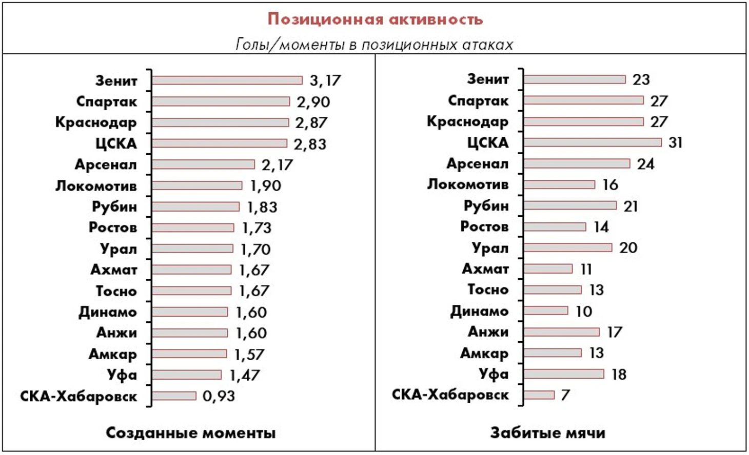 В «позиционке» старались проявлять инициативу все топы, кроме «Локомотива» (железнодорожники предпочитали выжидать, если соперник давал такую возможность), но только армейцам в конечном итоге покорилась планка один гол за матч (что вообще-то тоже не космос). Чемпион в позиционном нападении забил вдвое меньше серебряного призера, да и вообще по этому показателю оказался только десятым (!), уступив даже вылетевшему в итоге «Анжи».