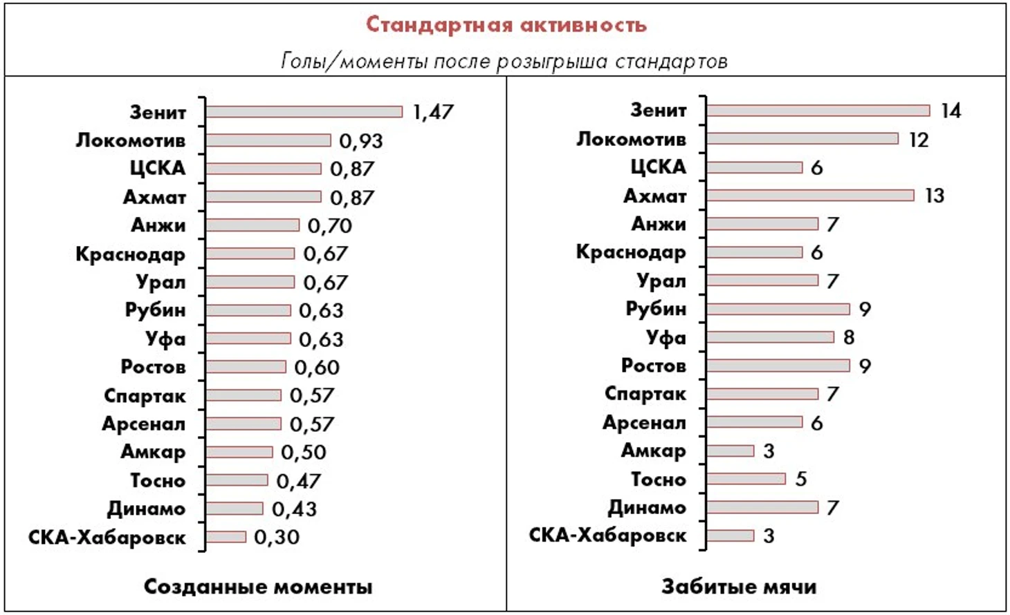 У «Ахмата» и «Локо» это оружие тоже работало исправно, причем – в отличие от «Зенита» – как навесная, так и ударная составляющая. Армейцы явно недобрали пару-тройку «стандартных голов», а динамовцы добились очевидного прогресса в этом компоненте после смены тренера (все 7 забитых мячей – во втором круге при Хохлове).