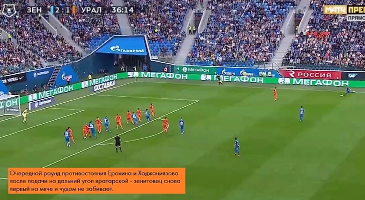 Навесные стандарты «Зенита», которыми Сергей Семак был недоволен на старте сезона, стали настоящим стихийным бедствием для гостей из Екатеринбурга. В первом тайме зенитовцы создали сразу 4 убойных момента после ювелирных подач Паредеса (разговоры о том, что с подачами у него беда, просто умиляют – и в ближайшее время постараюсь развернуто объяснить почему) – и во всех случаях ключевой фигурой в штрафной уральцев был Александр Ерохин.