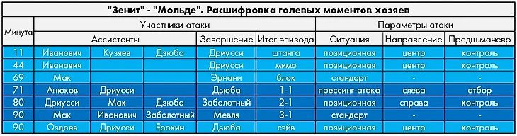 Если в первый час игры норвежские центрдефы вдвоем худо-бедно сдерживали Дзюбу, то с появлением еще двух великанов стали стремительно терять ориентацию в пространстве и остатки сил. Несмотря на вполне габаритный состав «Мольде» (3 защитника из 4 – по 186 см каждый, опорник Сарр – 189 см, форвард Халанд – 191 см), у «Зенита» было преимущество при любых разменах 1v1 (сразу 4 игрока – 190 см и выше, Эрнани – 188 см и сверхпрыгучий Иванович), и при стандартах – особенно.