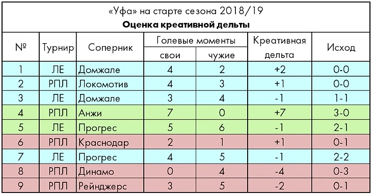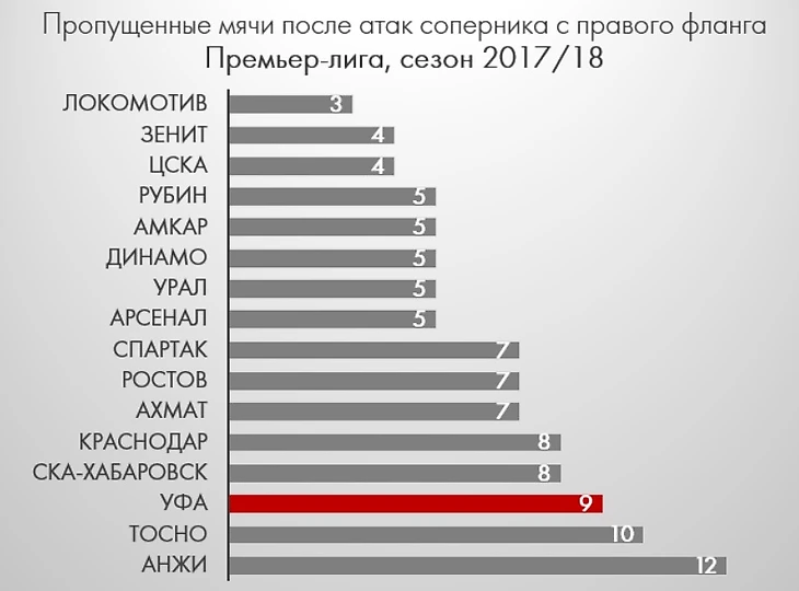 Кроссоустойчивость «Уфы» и в игровых ситуациях далека от идеала. После подач с флангов уфимцы пропускали от «Краснодара» и люксембургского «Прогресса» (дважды), после прострелов низом – от «Домжале», того же «Прогресса» (автогол Аликина) и первый гол от «Динамо».