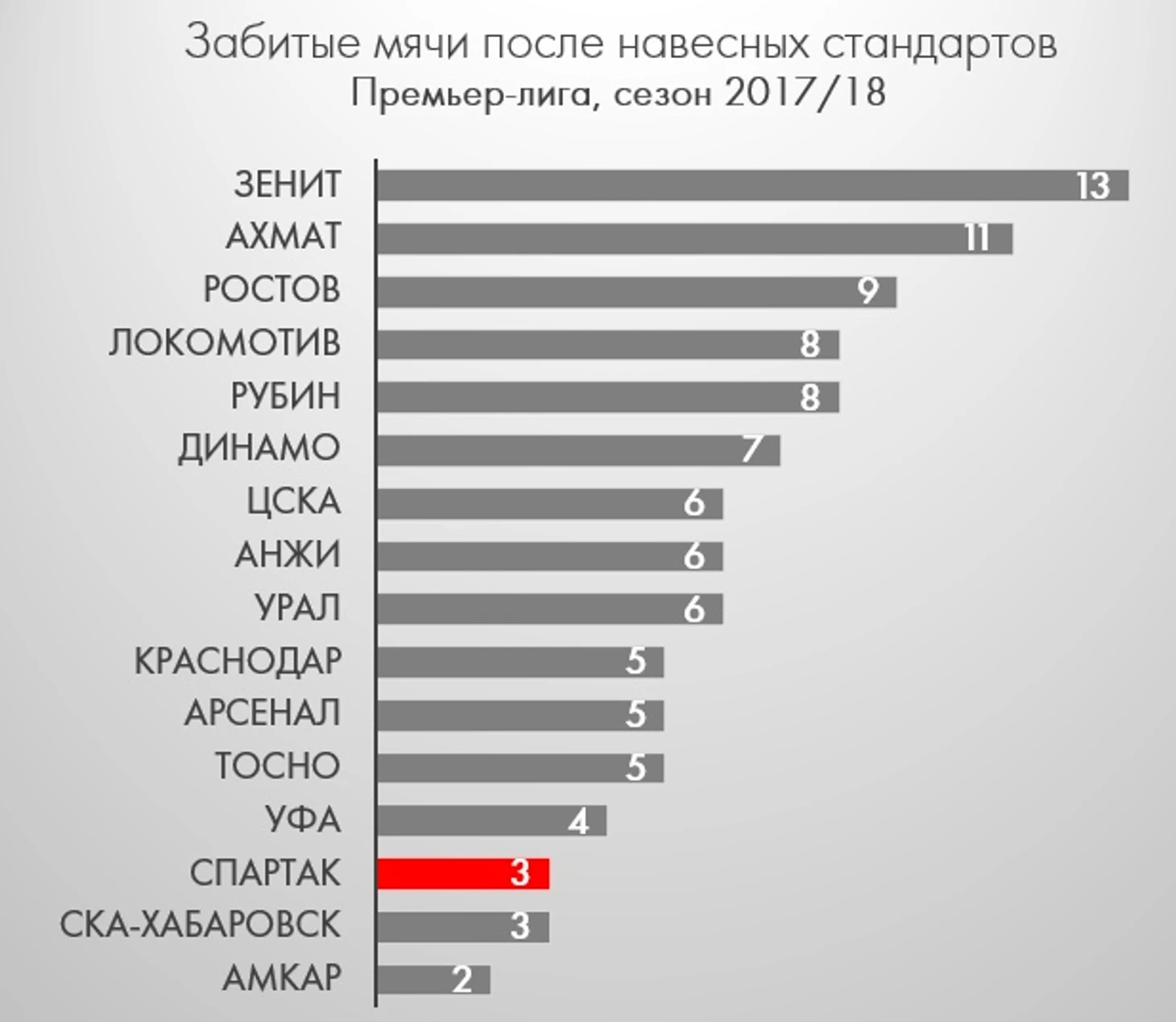4 из 5 голов «Спартака» в чемпионате были забиты непосредственно после розыгрышей навесных стандартов, а пятый – с пенальти, к назначению которого привела настырность лично Зе Луиша, а вовсе не какая-то ажурная комбинация.