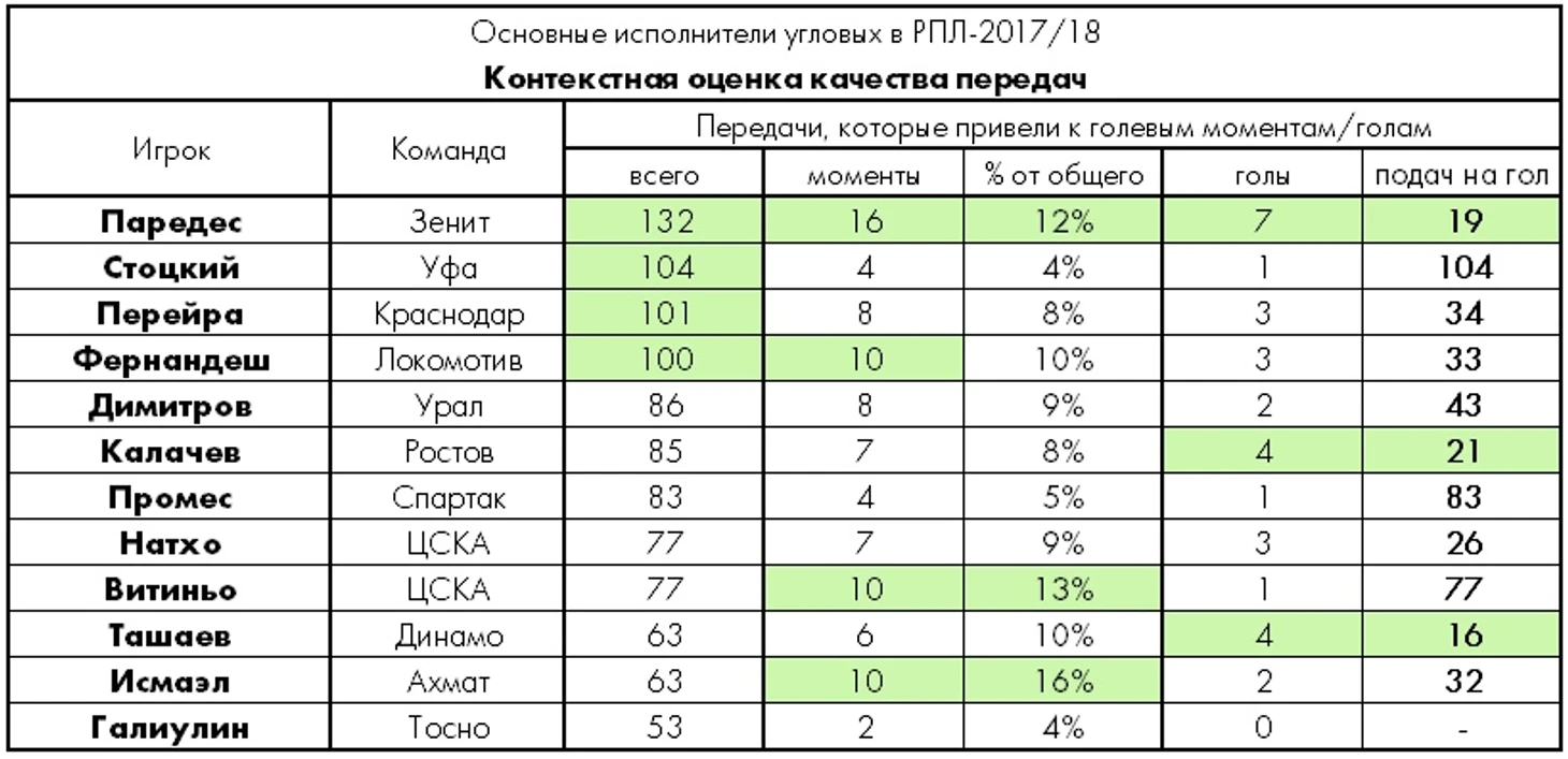 В новом сезоне сразу 4 фигуранта представленной дюжины (Промес, Витиньо, Натхо, Галиулин) покинули РПЛ, а еще двое (Ташаев, Стоцкий) сменили клубную прописку. Скоро увидим, приведет ли это к снижению продуктивности стандартов вообще и корнеров в частности.