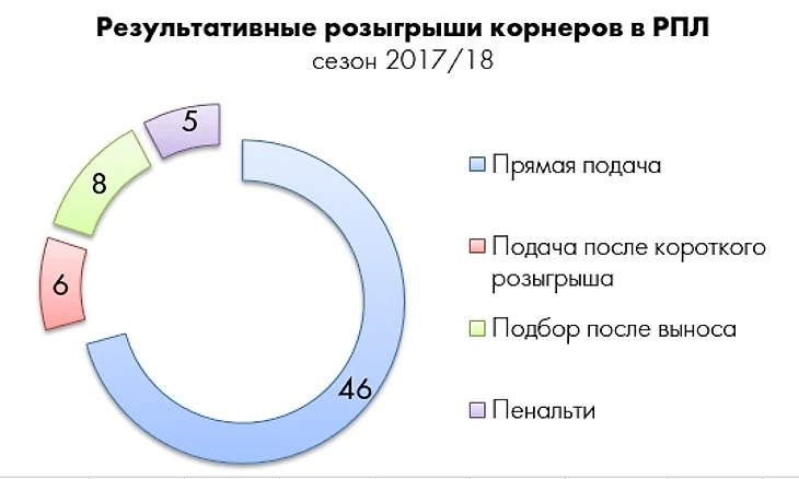 Розыгрыши угловых – основная «статья доходов», на которую пришлось больше половины результативных стандартов (65 из 122 – 53%). В это число вошли не только голы непосредственно после прямых подач с угла поля, но и, например, забитые в ситуациях, когда по ходу розыгрыша фиксировалось нарушение в штрафной с назначением и успешно пробивался пенальти.