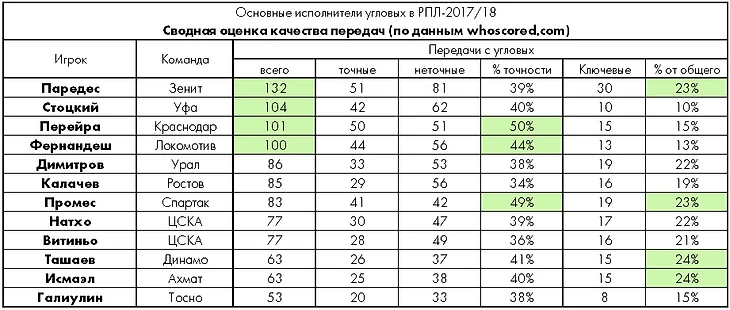 Паредес стал первым в абсолютном зачете (7 забитых мячей после его подач, включая «сухой лист» в матче с «Арсеналом») и вторым по числу поданных угловых на один результативный (19). При этом у аргентинца самая мощная статистическая выборка (в два с лишним раза больше, чем у Ташаева), а значит, и самые достоверные показатели качества.