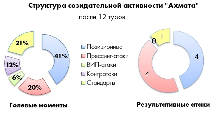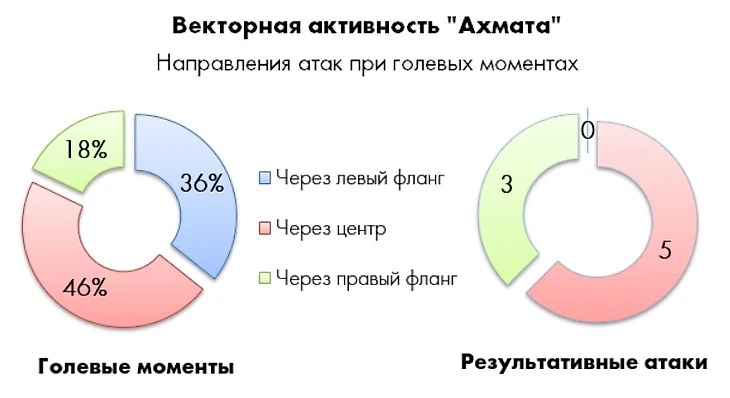 В атаках через центральную зону «Ахмат» забил 5 из 10 мячей в чемпионате, но три из них – дальними ударами (помимо Иванова, по разу отличились опорники Думбья и Исмаэл). В этом плане «Ахмат» значительно повысил свою продуктивность по сравнению с прошлым сезоном, когда за 30 туров забить  ударом из-за штрафной «с игры» получилось только однажды.