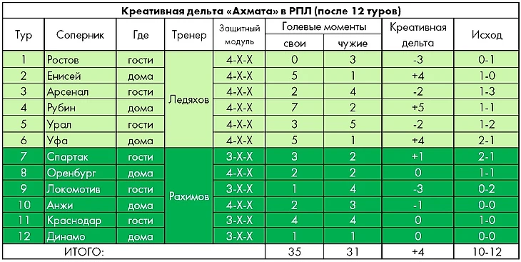 Судя по всему, Рахимов определился с игровой концепцией, сделав выбор в пользу схемы с тремя центральными защитниками (в 4 из 6 матчей, включая все три с топ-соперниками, игралась именно она)  - и, по крайней мере, до зимнего перерыва «Ахмат» наверняка будет продолжать  в том же духе. Большой плюс этой схемы конкретно для грозненцев – она позволяет более эффективно использовать впереди латералей, тем более что и у Мохаммади, и у Уциева есть подходящие для этого качества.