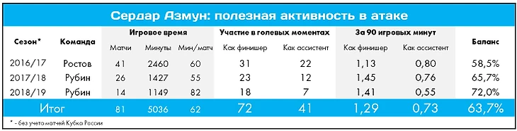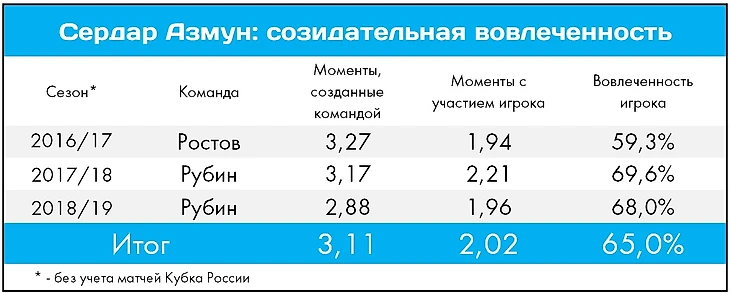 9 из 10 голов за полтора сезона в «Рубине» Азмун забил непосредственно после кроссов с флангов (включая стандарты) и вертикальных забросов из глубины (отлавливал скидки/отскоки), тогда как единственная голевая передача низом на Сердара пошла от Федора Смолова, а вовсе не от партнера.