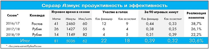 Для начала Сердар выдал выдающуюся безголевую серию длиной в 1016 минут, которую прервал только в матче 20-го тура против безнадежного хабаровского СКА. Затем внезапно преобразился в весенней части чемпионата (5 голов в 7 сыгранных матчах) – во многом благодаря своевременному приходу арендованного в «Зените» Нобоа (эквадорец организовал все 5 голов для Азмуна – отдал 3 голевые и 2 предголевые передачи).