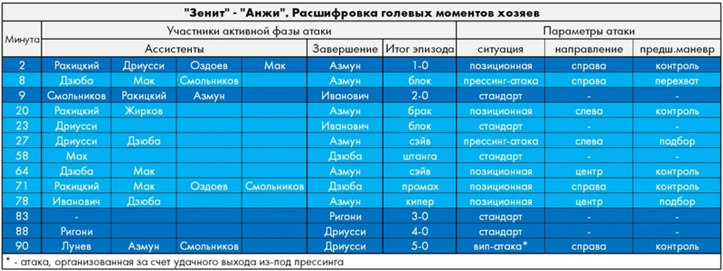 В матчах против низко обороняющихся соперников фактор быстрого гола очень часто становится ключевым, и у «Зенита» в первой части сезона таких примеров было достаточно (здесь можно вспомнить гостевые поединки с «Уфой» и «Оренбургом», а также домашний с «Ростовом»). Против «Анжи» ставка на блицкриг тоже сработала.