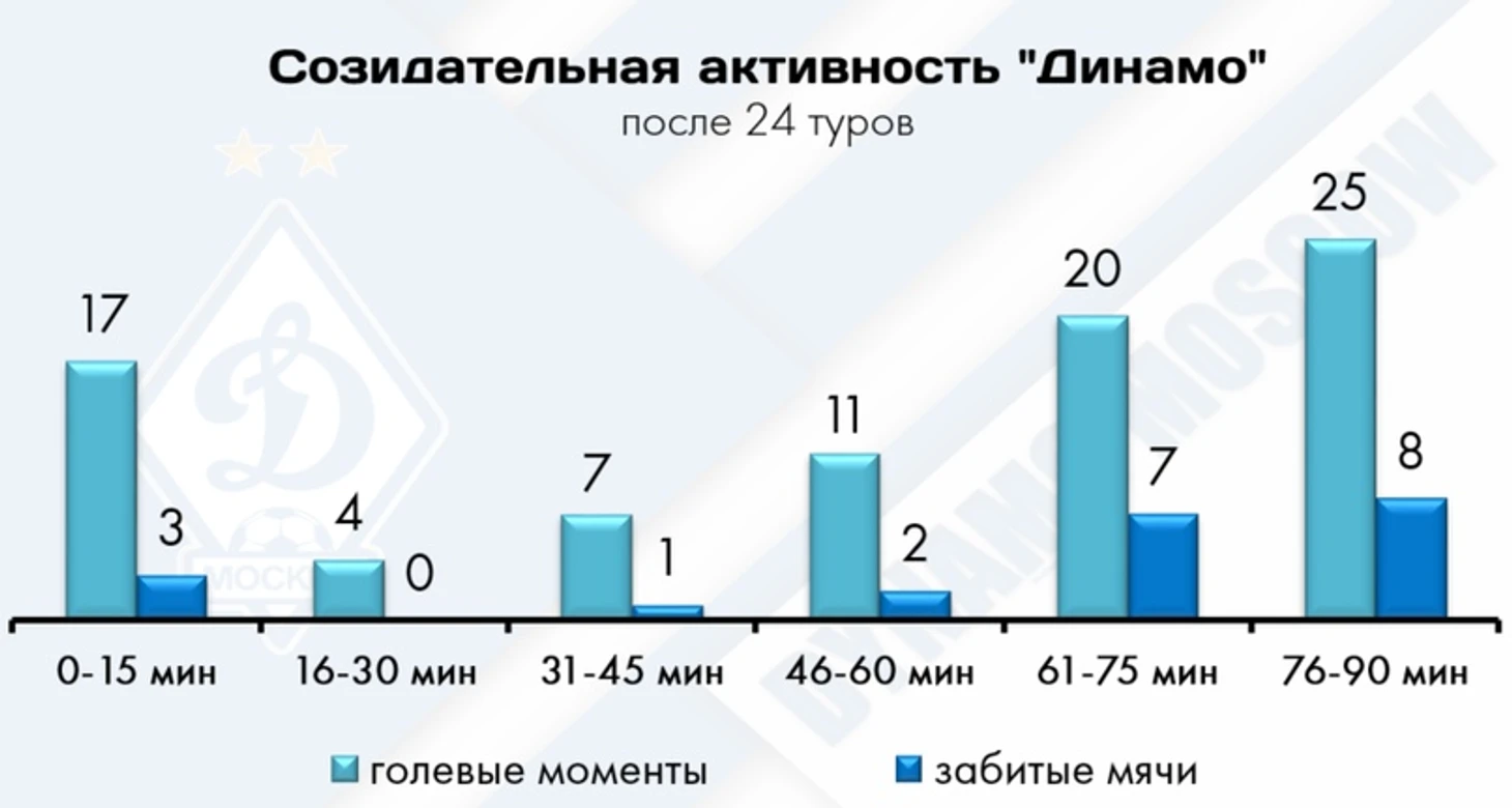А вот в последней трети матча динамовцы почти всегда прибавляют и способны играть в давление против любого соперника: сводный креативный баланс на этом отрезке составляет солидные 45-20, да и разница забитых и пропущенных мячей 15-3 говорит сама за себя.