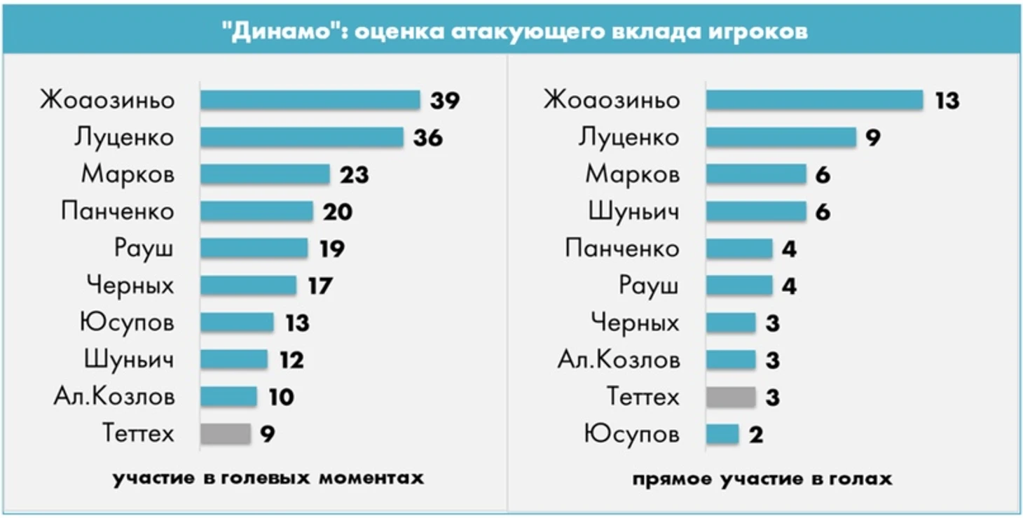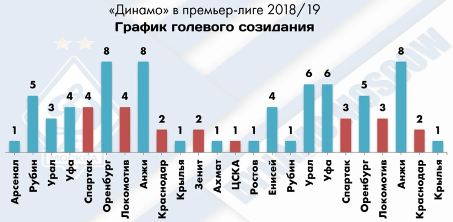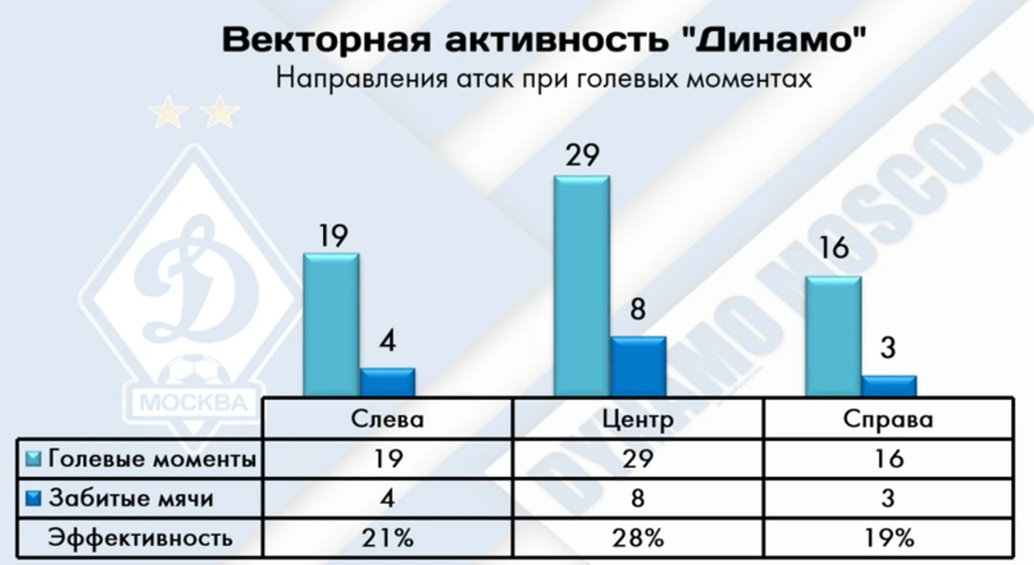 «Динамо» достаточно много атакует флангами, но голевой выхлоп фактически близок к нулю. Только на старте чемпионата за счет очень неплохой формы Рауша и его качественных кроссов/прострелов бело-голубые забивали хоть что-то (4 мяча в первых 7 турах). После этого наступила тотальная засуха, которую удалось размочить только в декабрьском матче с «Уралом» (3 гола из 4 после фланговых прорывов).