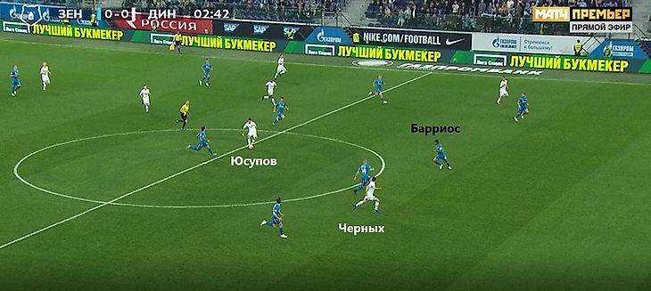 При этом на флангах пространства хватало, особенно в ситуациях, когда зенитовцам удавалось оперативно смещать вектор атаки длинными переводами или выбираться из-под высокого прессинга. Впрочем, команда Хохлова активно щупала «Зенит» прессингом только в первые 10-15 минут, и разбивать его получалось без особых проблем и форс-мажоров.