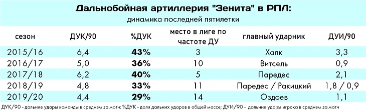 Дело в том, что при Семаке «Зенит» очень мало бьет издали – только 11 место в лиге по итогам прошлого сезона (4,8 удара за игру) и только 14 в текущем (4,4). В пересчете на процент владения и по доле в общей ударной массе, это с отрывом «худший» показатель в лиге в обоих сезонах. Все основные конкуренты бьют из-за штрафной примерно вдвое чаще.