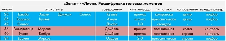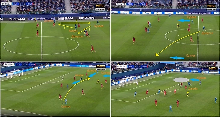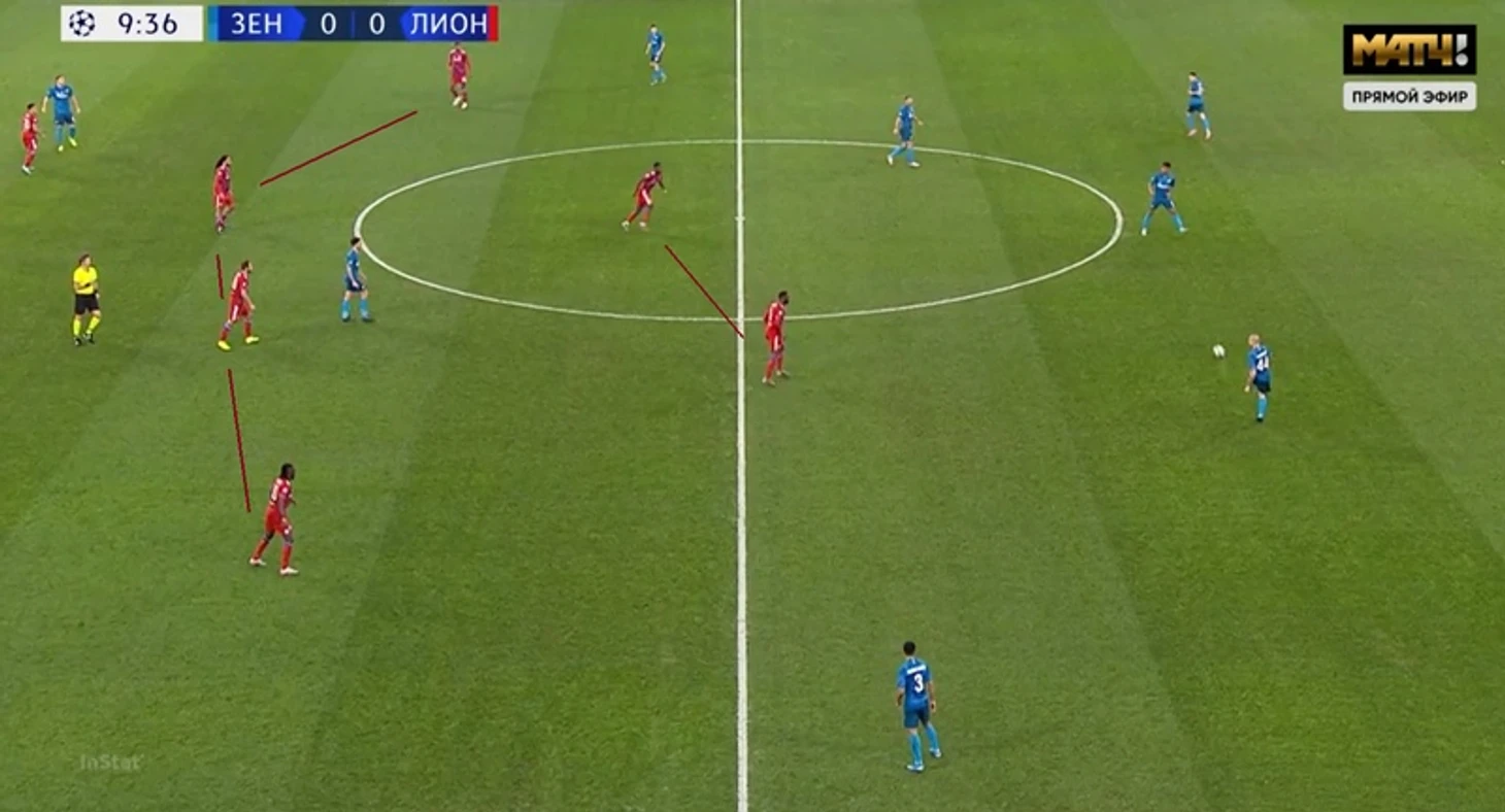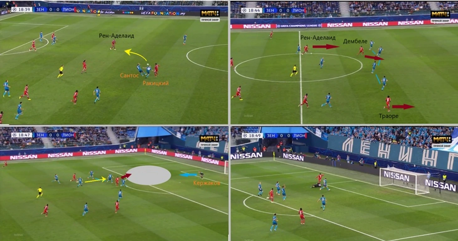 Из-за симметрии схем обеим командам было сложно создавать ситуации локального большинства в атаке в позиционной статике, а потому очень многое зависело от эффективности и скорости принятия решений в переходных фазах. При этом и «Зенит», и «Лион» в первом тайме закономерно отказались от излишнего риска и сверхагрессивного прессинга, прибегая к нему скорее ситуативно, но не системно.