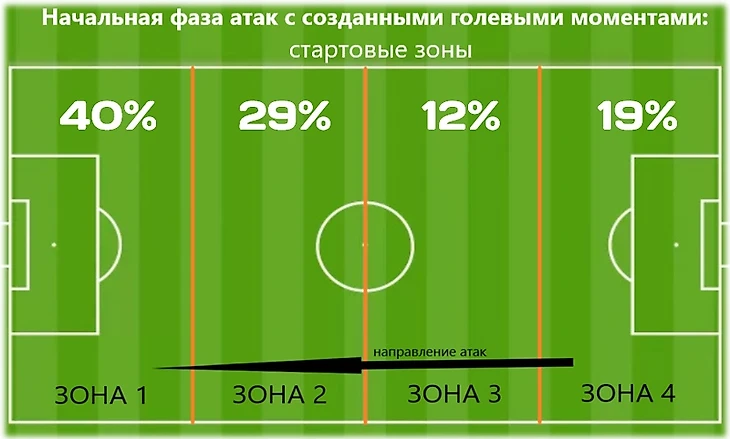 Особенно опасны вертикальные атаки красно-белых после неудачно разыгранных соперниками угловых, да и вообще доля остроатакующих цепочек, стартовавших непосредственно от собственной штрафной (зона 4), очень высока для команды, которая преимущественно играет в контроль.