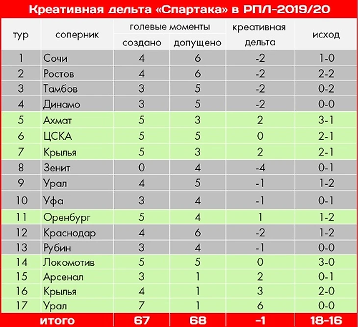В матчах с соседями по таблице – «Арсеналом», «Крыльями» и «Уралом» – красно-белые набрали только 4 очка, однако по соотношению созданного и допущенного (+11) этот короткий отрезок оказался для них лучшим в сезоне. При этом если брать турнирную дистанцию в целом, «Спартак» выходил в плюс всего лишь в 6 поединках из 17, включая как раз последние три.