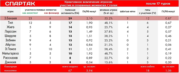 «Спартак» нечасто балует поклонников ажурными комбинациями с тонкими передачами вразрез (из 52 голевых моментов «с игры» такие были зафиксированы только в 15 случаях), но Зелимхан регулярно организует моменты партнерам как раз такими пасами (8/15).