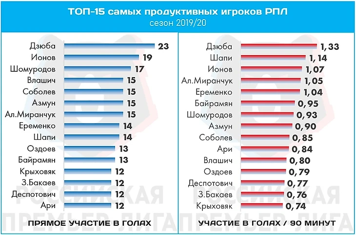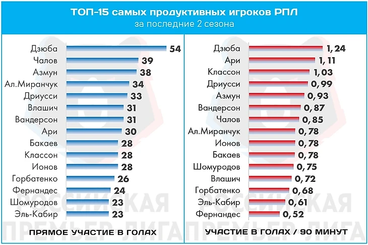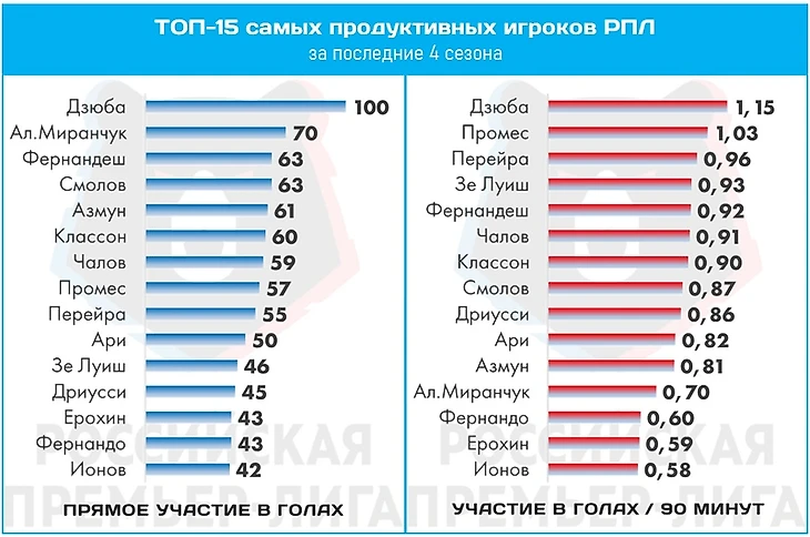 В итоге за 4 неполных сезона Артем лидирует в сводном рейтинге продуктивности, причем в абсолютном зачете отрыв от ближайших преследователей – Алексея Миранчука и Федора Смолова – просто огромен. Если же ориентироваться на усредненные цифры в пересчете на игровое время, то и здесь Дзюба значительно опережает коллег по цеху, а помимо него, планку в 1 гол за 90 игровых минут стабильно держал только экс-спартаковец Квинси Промес.