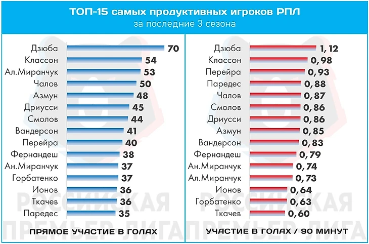 Тот же Алексей Миранчук впервые в карьере вышел на этот уровень продуктивности только в текущем сезоне (1,05 голов за игру), шаг за шагом прибавляя в каждом из трех предыдущих. Обратная ситуация у Смолова, который после перехода в «Локомотив» выпал из топ-15 двух последних сезонов, но на краснодарском багаже все же удерживается в тройке лучших по итогам неполного четырехлетнего цикла.