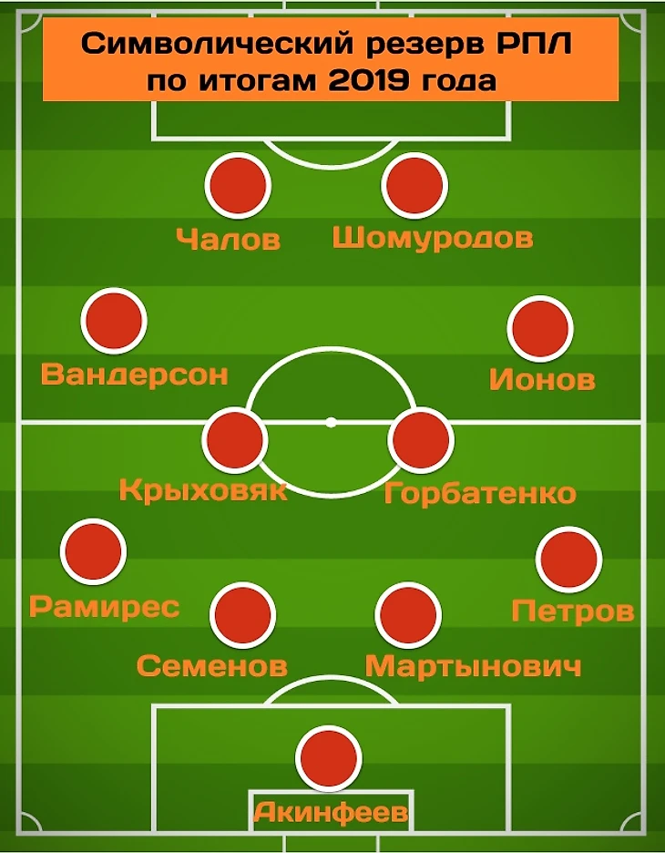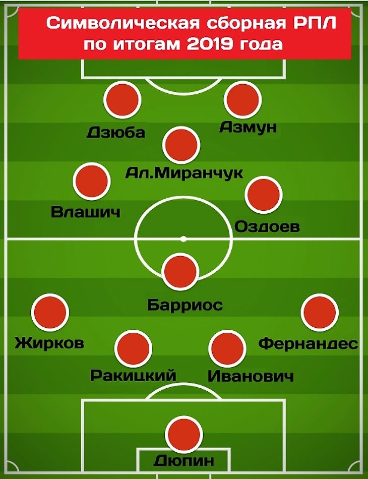 Что касается схемы, то с учетом возможностей исполнителей у нас вырисовывается 4-4-2 (ромб), и символическая сборная РПЛ по итогам 2019 года по версии «Инженерного подхода» выглядит так:
