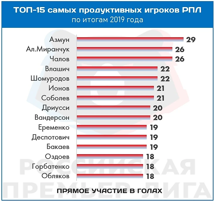 Магомед стал самым продуктивным опорником лиги в 2019-м, поучаствовав в 18 результативных атаках (3 гола + 15 ключевых передач). Столько же набрали Игорь Горбатенко из «Арсенала» (4+14) и периодически игравший в центре Иван Обляков из ЦСКА (5+13), однако у обоих более выражена «стандартная» составляющая (4 и 8 голов соответственно, у Оздоева – только 1). Самым результативным опорником лиги с 9 голами стал Гжегож Крыховяк, но у него только 7 ассистентских баллов за год и четвертая сумма в итоге (16).