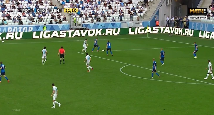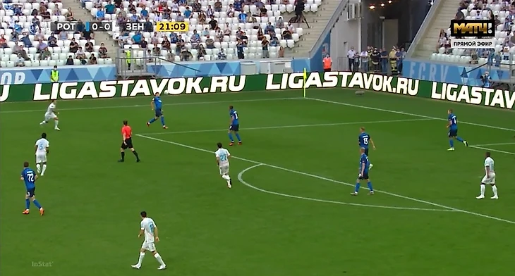 О второй фазе атаки можно было бы вести речь только в том случае, если бы мяч от головы защитника Байрыева, с которым боролся Дзюба, попал бы напрямую к Дриусси – иными словами, если бы итогом этой микродуэли Дзюба-Байрыев стала бы потеря владения хозяевами. Но Байрыев скинул точно на партнера, так что даже чисто формально, следуя официальным правилам ИФАБ, здесь нет оснований считать, что Дзюба как-то ему помешал.