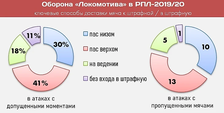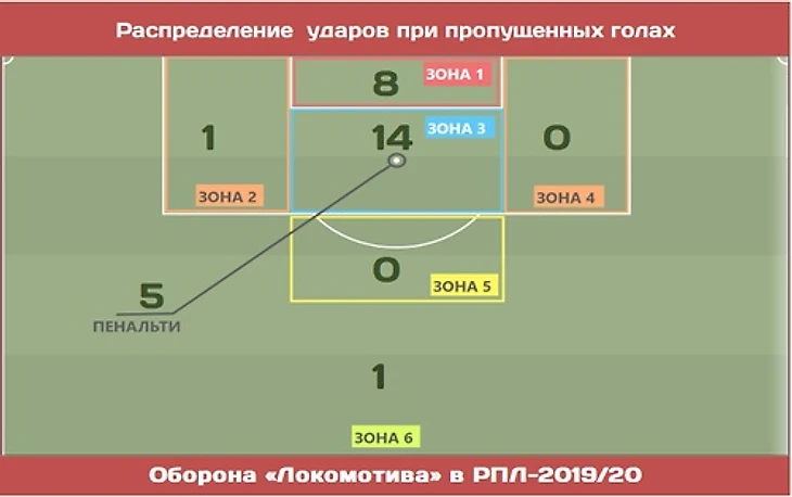 15. Несмотря на проблемы на флангах и значительном количестве пропущенных мячей после подач и забросов в штрафную (13/29 в минувшем чемпионате и 3/6 на старте нынешнего), «Локомотив» традиционно хорош при обороне на стандартах у своих ворот. В сезоне 2018/19 в рамках РПЛ с угловых и фланговых штрафных «железнодорожники» пропустили только 3 мяча, в сезоне 2019/20 – всего лишь один (лучший результат в лиге наряду с «Рубином»).