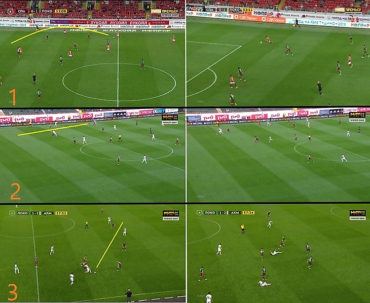 При контроле мяча соперником на фланге линия обороны «Локо» располагалась достаточно высоко, поджимая прессингующую группу ради сохранения вертикальной компактности, и не успевала реагировать на передачи за спины, которые оборачивались максимально комфортными выходами один-на-один (дважды на эту удочку попался Мурило).