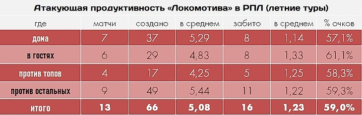 1. «Локомотив» этим летом не блещет результативностью: 16 забитых мячей (5 из них – с пенальти) в 13 матчах в рамках РПЛ – это почти вдвое меньше, чем у «Зенита» за тот же период (31). При этом в креативном плане у «железнодорожников» все довольно неплохо. В среднем команда создает 5,1 голевых моментов за матч (2,6 – явные), но реализация оставляет желать лучшего – лишь 24%.