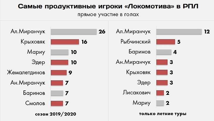 6. На летнем отрезке зависимость команды от Алексея только усилилась: до травмы, полученной им неделю назад в матче со «Спартаком», он поучаствовал в 12 из 14 (!) голах «железнодорожников». Интересно, что вторым по продуктивности за отчетный период стал молодой вингер Дмитрий Рыбчинский (5 голов с участием за 470 игровых минут), от которого особенно больно досталось «Рубину» (в двух матчах с казанцами – 3 голевых передачи плюс заработанный пенальти).